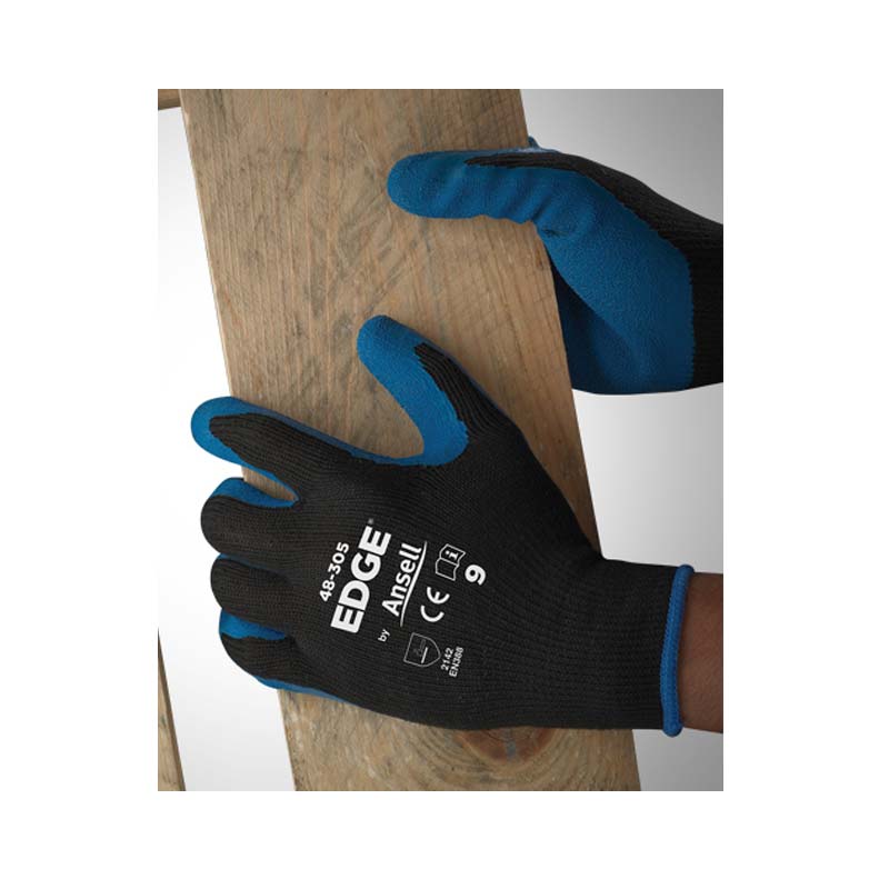 A Luva Tricotada de Poliéster Edge 48-305 – Ansell é banhada na palma, face palmar e ponta dos dedos em látex de borracha natural, tricotada em poliéster, palma antiderrapante com acabamento corrugado, punho tricotado em poliéster.